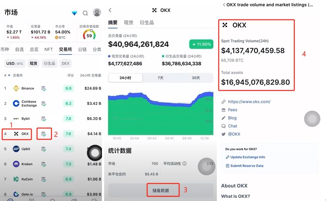 它里面分为几个部分,第一个是他有一个小金币打对钩样式的LOGO,我们点击一下,你能够看到OKX的储备数据,我们点击【储备数据】。储备数据其实就是OKX的资产证明,OKX通过公布自己的资产证明给外界,就能够让外界知道,他的总共资产一共有这么多。