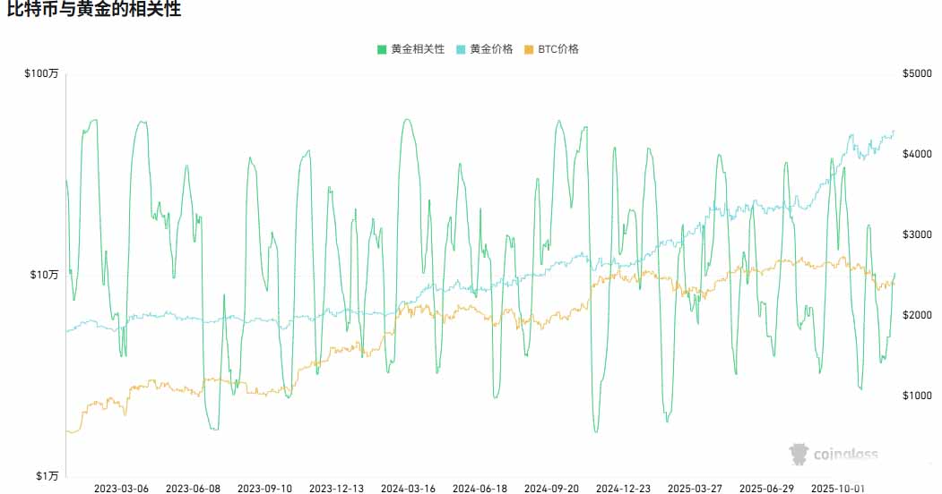 比特币与黄金相关性,来源coinglass