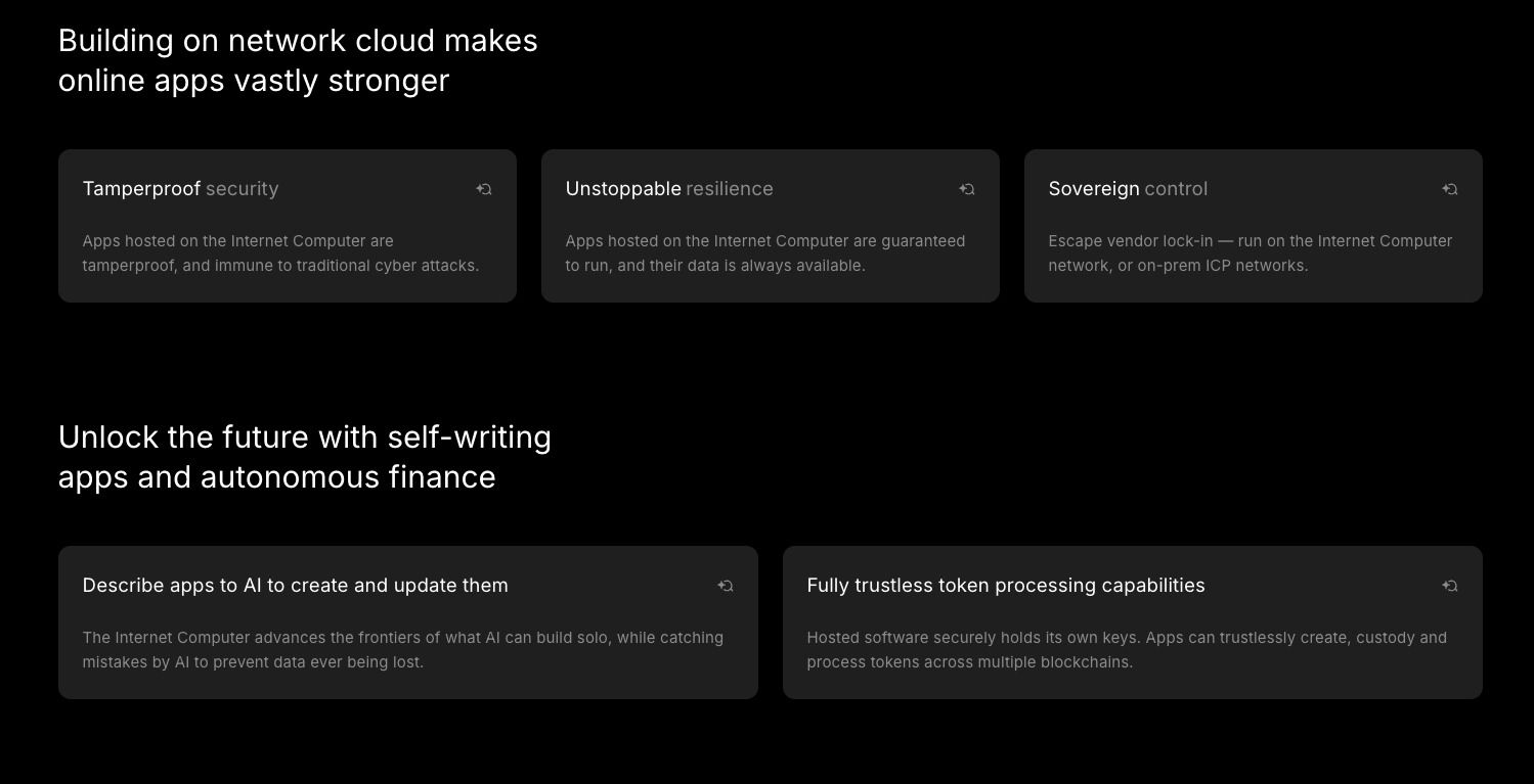 ICP 排名第 45-65 位,日交易量为 5600 万至 8900 万美元,与以太坊、Solana 和 Avalanche 在智能合约平台领域竞争。它通过网络速度执行(用户无需燃气费)、链上全栈托管(相对于链下前端)和人工智能原生开发工具来区分自己,在可扩展性和成本可预测性方面优于传统的 L1。