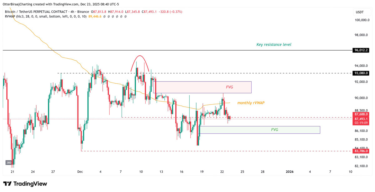 从技术面来看,比特币仍处于85,000至90,000美元的区间内,多次未能突破阻力位并持续上行。目前,BTC价格低于月度成交量加权平均价(VWAP)指标,这进一步强化了中性偏谨慎的市场基调。