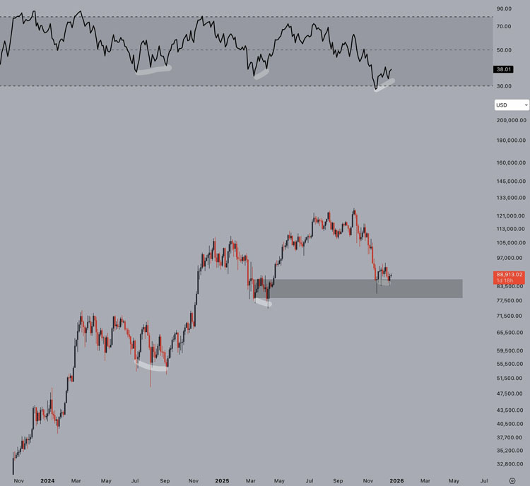此外,比特币的三日图表正呈现看涨背离形态:价格创出更低的低点,但动能并未随之降低。