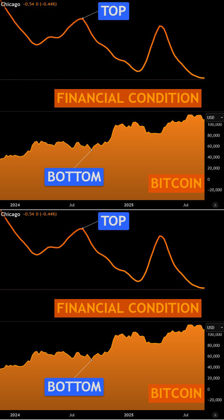 分析师米亚德·卡斯拉维对105个指标的回测显示,国家金融状况指数(NFCI)的高位往往领先比特币上涨四到六周。