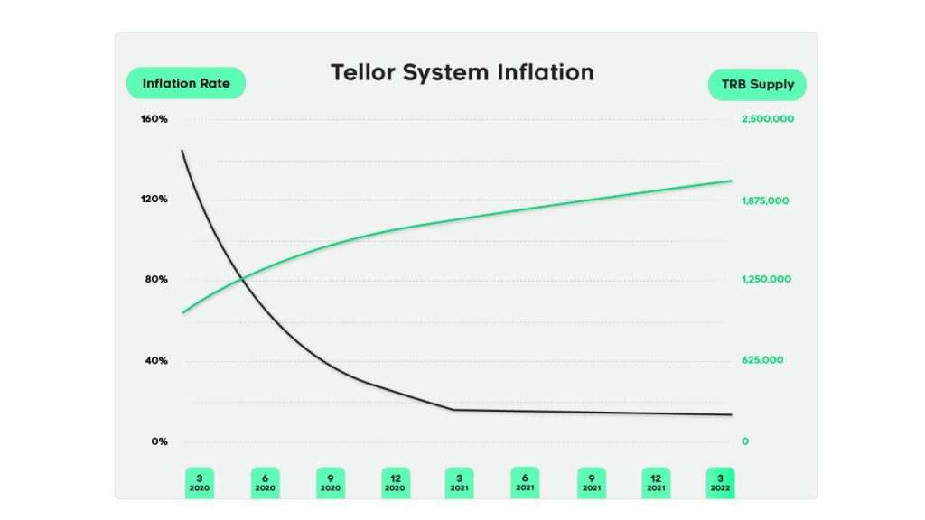Tellor 的总供应量由使用率和挖矿率决定。当前 TRB 币的总供应量为 2,751,764 TRB,流通供给量为 2,665,565 TRB。