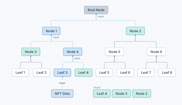 通过使用 Merkle 树(一种哈希数据的层次结构),cNFTs 被作为“叶子”存储,并与根节点相连接。每个“叶子”代表一个哈希数据(例如 NFT 的元数据),这些数据不断配对,直到形成一个根哈希。这个结构使得每个 NFT 的数据能够快速且安全地进行验证,而不需要完全存储在链上。
