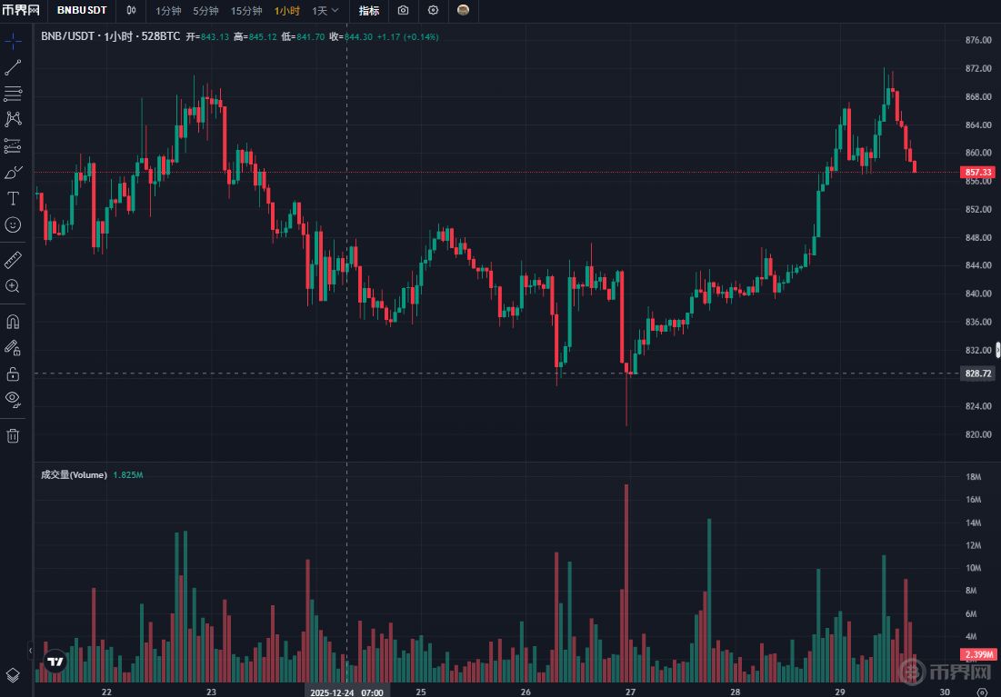从短期市场结构观察,BNB在2025年底面临的关键阻力位于861-950美元区间,这一位置既是历史成交密集区,也对应着心理整数关口。突破这一区域需要显着的增量资金配合;