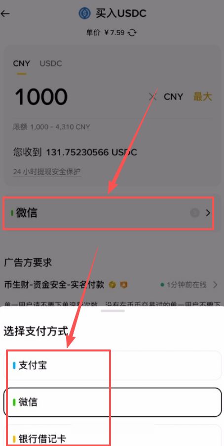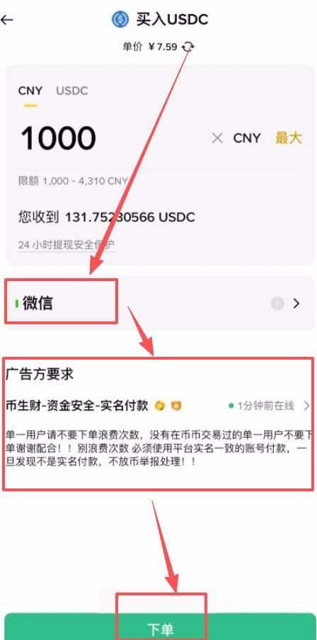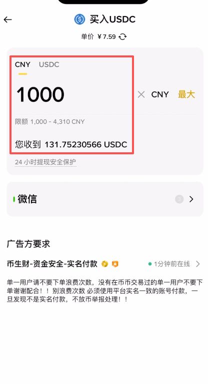 1、输入金额:输入你想购买的人民币金额(注意查看商家的最低限额,例如 1000 元起)。系统会自动计算出你能获得的 USDC 数量。