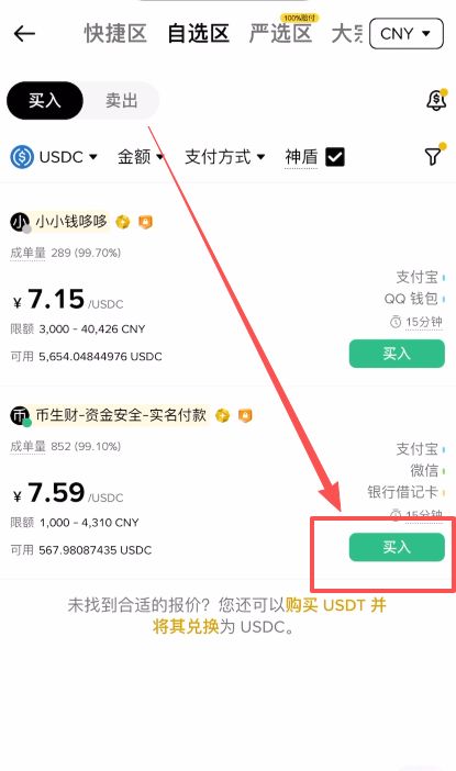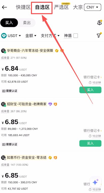 在页面上方可以看到不同的交易区,为了获得更好的价格和选择权,我们通常使用「自选区」的买入模式,而不是快捷买币。