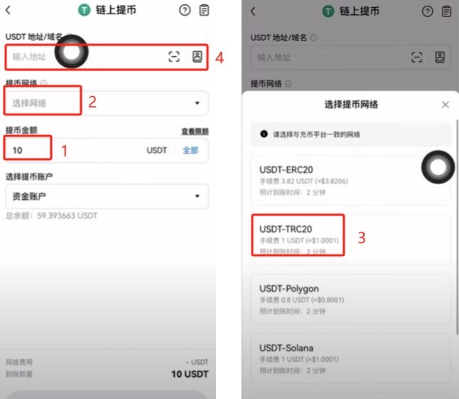 输入提币金额,我这里输入10U。最上方需要输入提币的地址,把你要提到的交易所或者是钱包的充币地址贴到这里。再选择提币网络。这个提币网络就相当于你电汇的时候到底要汇给哪个账号,汇给哪个银行。我们点击一下可以看到,这里有很多网络供你选择,有TRC20、ERC20等等。每一种网络对应的时间以及成本都是不一样的。就相当于不同的银行都有不同的费用一样。你一定要根据你这个收币的情况选择对应的网络。一般我都是使用这个TRC20的网络。然后你输入你对应的地址进行提币就可以了。