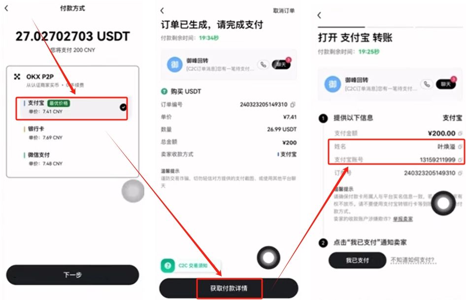 这里有三种支付方式可以选择。分别是支付宝、银行卡还有微信支付。如果你选择了支付宝,我们先点击【获取付款详情】。卖家会把他的支付宝账号、姓名发给你。然后你用你的支付宝给他直接转账就可以了。