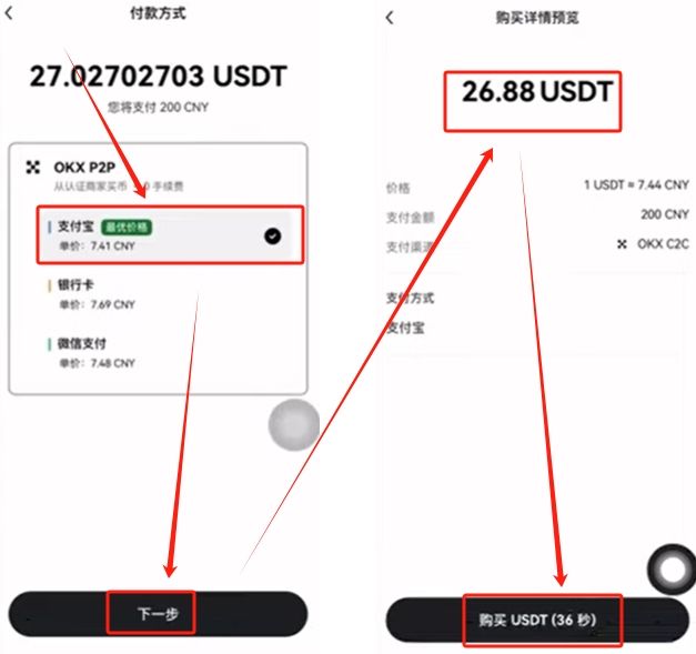 我们选择完支付方式之后,点击【下一步】。他会告诉我们支付200人民币大约收到26.88颗USDT,点击【购买USDT】