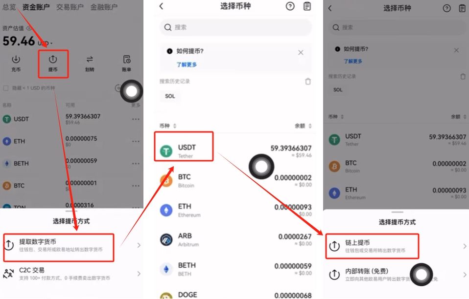 其中内部转账就是你给你其他的欧易的账户来进行提币,这个是免费的,非常的方便好用。链上提币就是你把你的USDT提到其他的交易所或者是电子钱包里面。我们选择【链上提币】