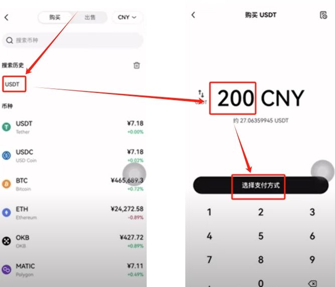 我们选择要购买的币种是USDT,输入你要购买的金额,点击【选择支付方式】