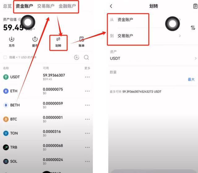接下来我们来看一下该怎么提币。提币你可以理解为就是数字货币里面的银行汇款。首先我们需要把我们的USDT放到资金账户里面。这里一共有三个账户。分别是资金账户、交易账户还有金融账户。如果你的资金在交易账户或者是金融账户里面,你就可以点击【划转】,将你的资金通过划转的方式转移到资金账户里面。