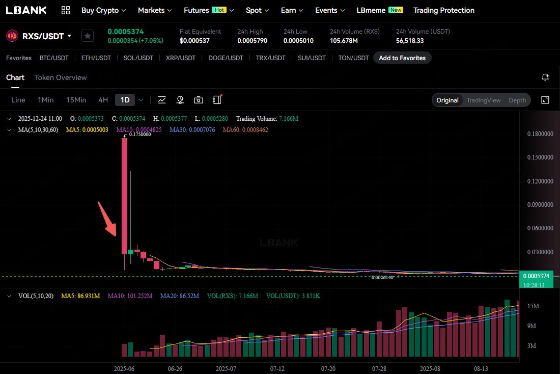 2025 年 6 月公开发行后,RXS 价格遭遇严重市场动荡,几乎在上市瞬间就暴跌约 99%。这次崩盘让预售期间进场的早期投资者损失惨重。