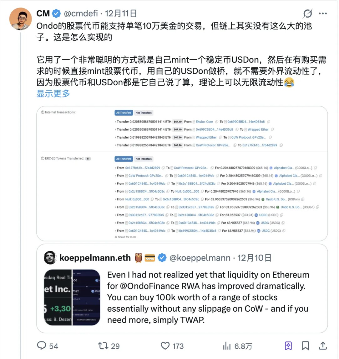 6.Ondo 的股票代币能在链上支持单笔 10 万美金的交易