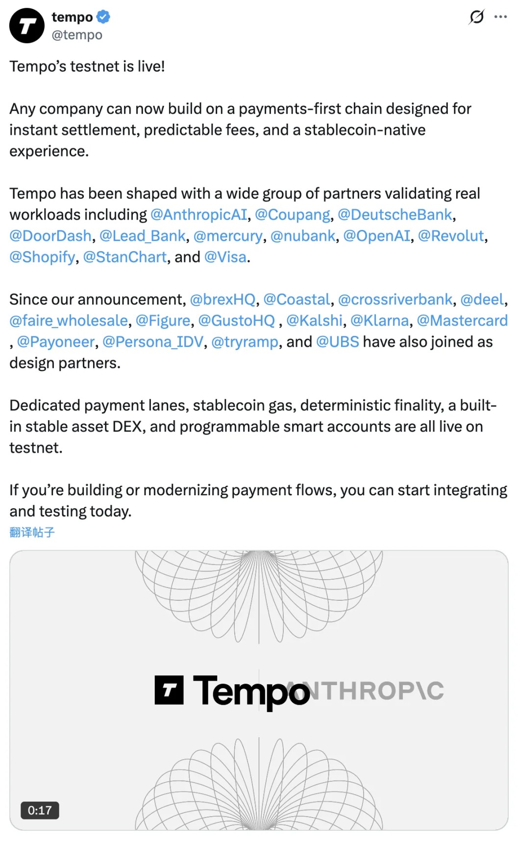 Stripe 和 Paradigm 共同孵化和开发,合作伙伴 Anthropic AI、Coupang、Deutsche Bank、DoorDash、Lead Bank、Mercury、NuBank、OpenAI、Revolut、Shopify、Standard Chartered、Visa。