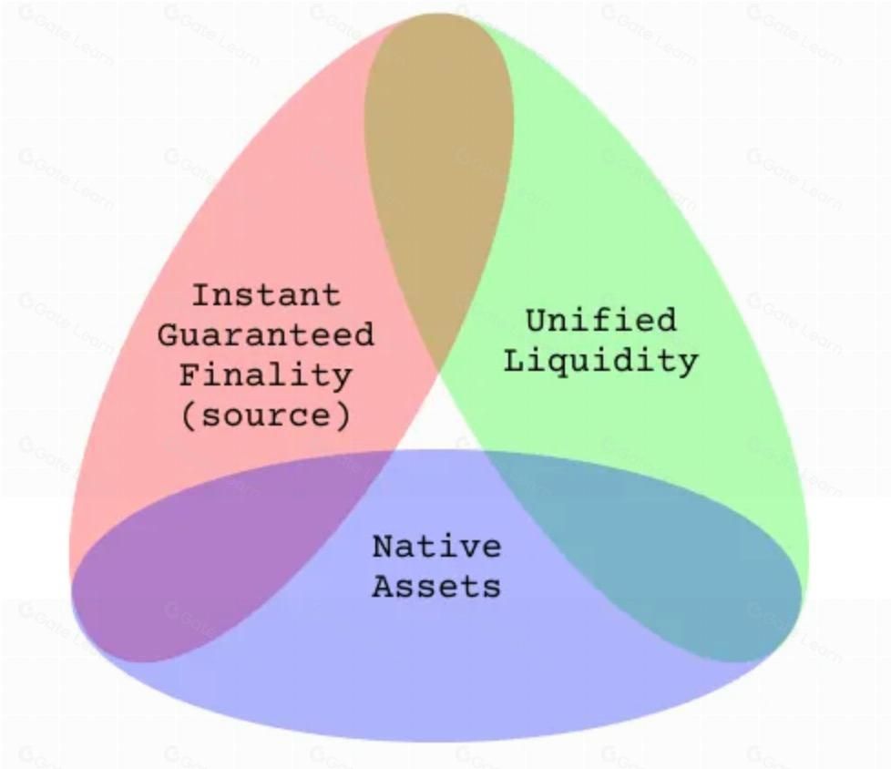 Stargate Finance团队提出了在跨链资产桥中存在一个“不可能三角”,即时验证确认(交易确认时的时效性得到保证)、统一流动性(单个流动性池在多条链之间的共享访问)和资产原生性(用户通过跨链桥直接获得原生资产,而非合成封装资产)这三者无法完全兼顾,开发者只能选择其一或者其二。
