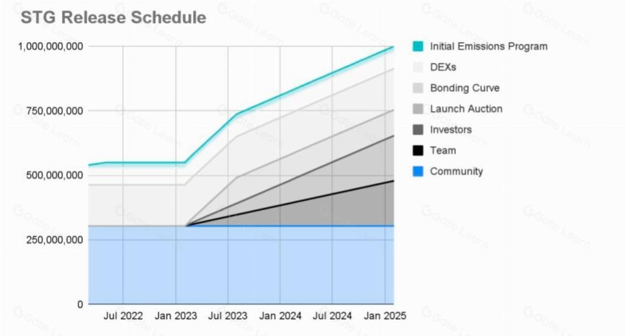 分配给内核贡献者和投资者的代币会在第一年完全锁定,之后的两年内线性释放。用于Bonding Curve、初始释放计划、早期DEX流动性以及未来社区的STG代币都是在上线时直接释放,代币解锁时间图如下: