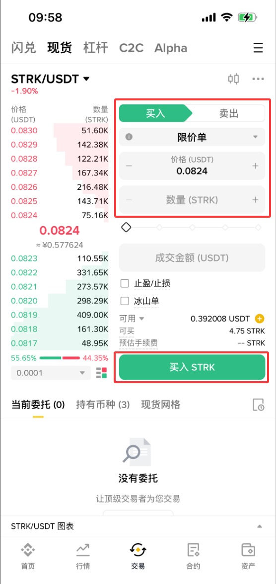 5、依次选择【限价单】-购买【价格】-购买【数量】-【成交数量】,设置好之后,点击【买入STRK】。