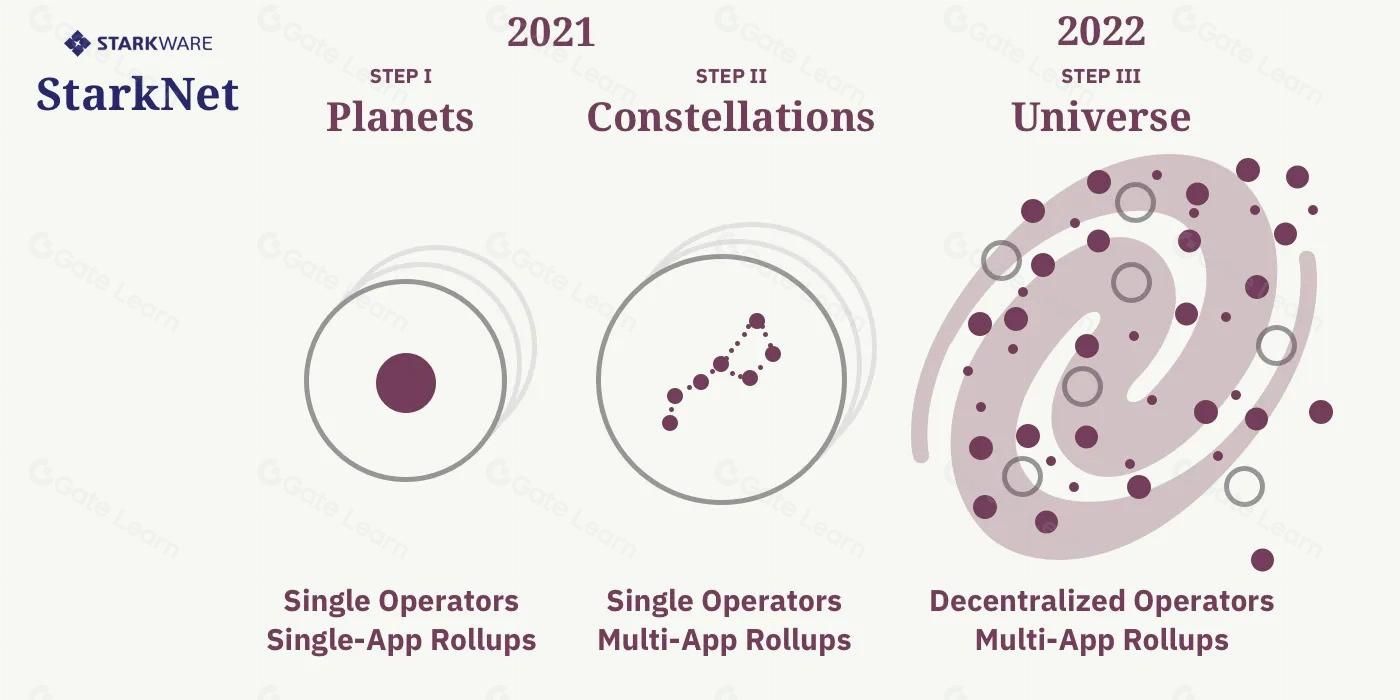 StarkWare 在 2020 年引入了 StarkEx,这是一种经许可的扩容解决方案,为最终成为 Starknet 的基础奠定了基础。StarkEx 迅速被dYdX 和 Immutable X 等平台所采用,显示出该技术的潜力。在此基础上,StarkWare 开发了 Starknet,这是一个无需许可的第二层扩容方案,用于改善以太坊的扩容性。Starknet 在2021年11月正式推出其创世区块,标志着一个重要的里程碑。