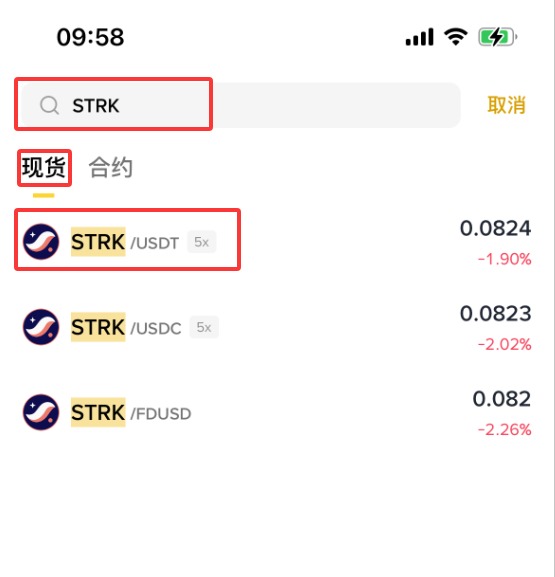3、输入【STRK】,这时下拉会显示【现货】【STRK/ USDT】,点击【STRK/ USDT】。(作为新手,不建议做合约,所以这里就不演示合约购买方式了。)