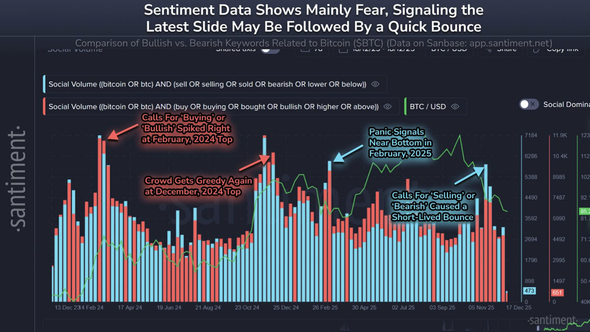 本周早些时候,比特币跌破8.5万美元,投资者的社交媒体情绪受到重创。据市场情报平台Santiment称,此后看跌言论在包括X、Reddit和Telegram在内的社交媒体平台上占据主导地位。