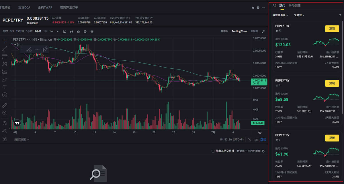 选择你想自动交易的币种对,例如 BTC/USDT、ETH/USDT、SOL/USDT 等
