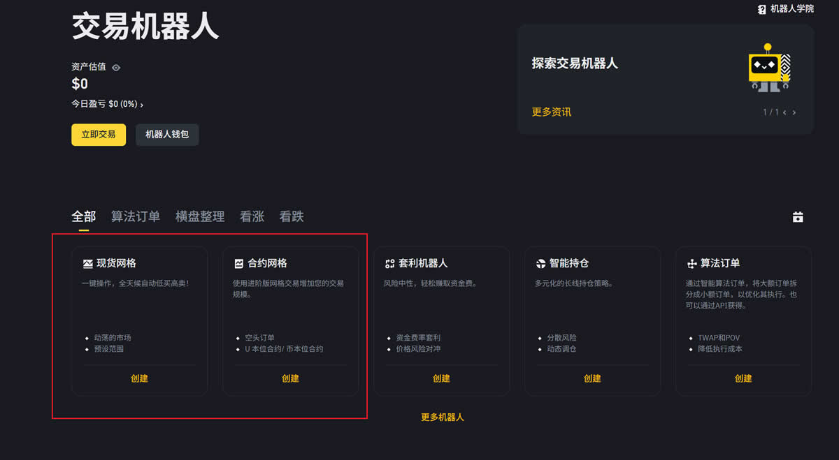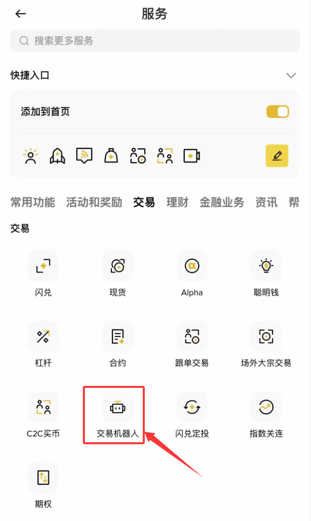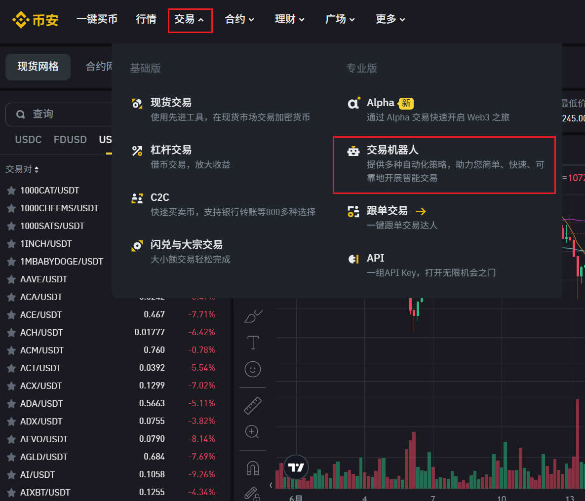1.登录币安(官方注册 官方下载)选择【交易】然后【点击交易机器人】