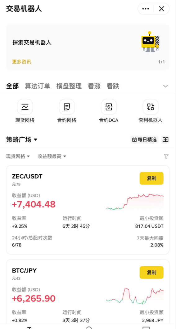 选择“现货网格”或“合约网格”中的“现货自动策略”(注意名称有可能显示为“网格”或“区间套利”)