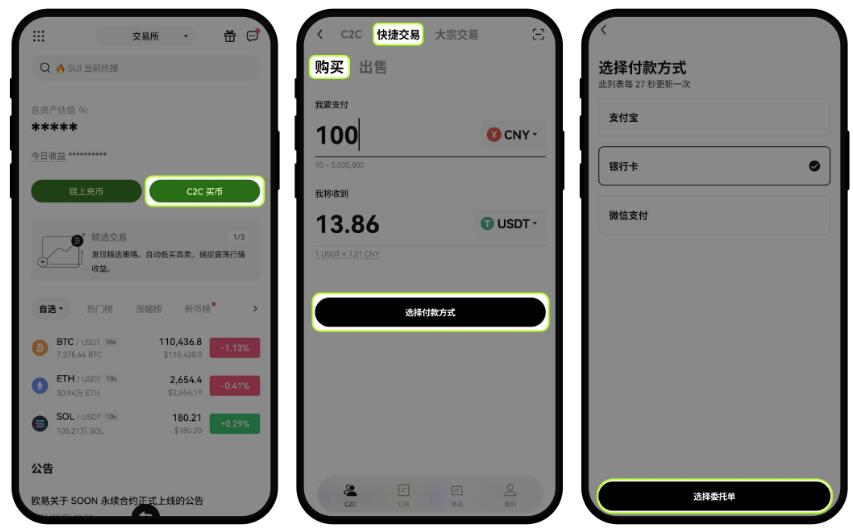 打开 App,点击【C2C 买币】-【快捷交易】-【购买】,然后 选择需要购买的数字资产;