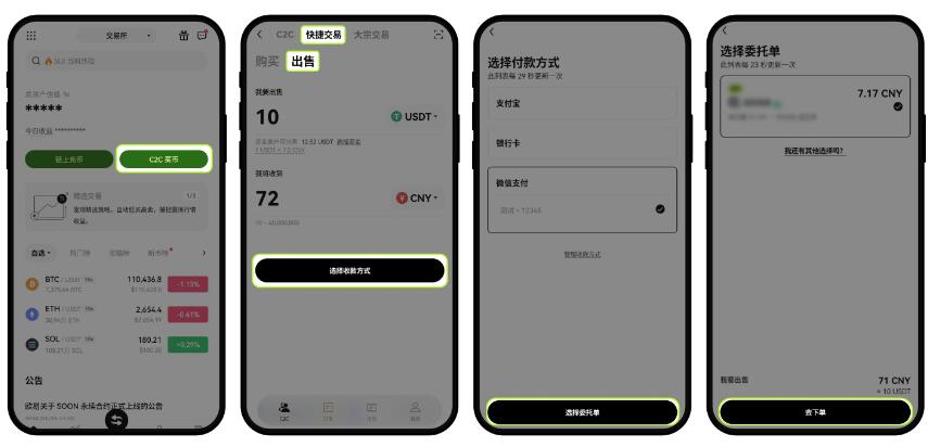 打开 App,点击【C2C 买币】-【快捷交易】- 【出售】,选择需要出售的数字资产;