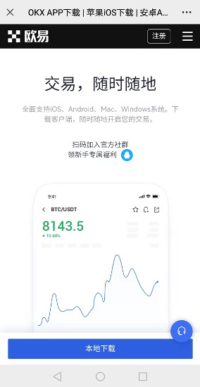安卓手机下载:打开欧易网站,点击下载图标,用手机扫描出现的二维码(建议用浏览器进行扫码,微信扫码可能会出现网页停止访问的情况),点击【本地下载】,然后根据提示完成下载、安装。