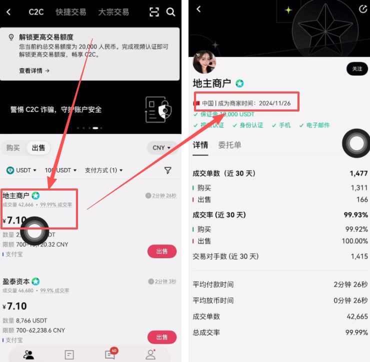 我们再来看一下其他家,比如说“双龙商贸”这一家。它是在24年1月份注册的,这家注册时间已经超过一年了。而且他近30天的成交率都是100%,平均付款时间是在2分27秒,平均放币时间是在46秒。我们就可以跟这家来进行出售,点击它旁边的“委托单”,点击【出售】。