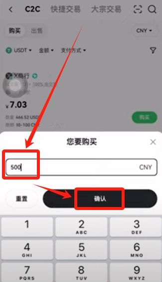我们选择完币种之后,输入一下想要购买的金额,比如说我想要购买500人民币的USDT,就输入500块 ,点击【确认】。